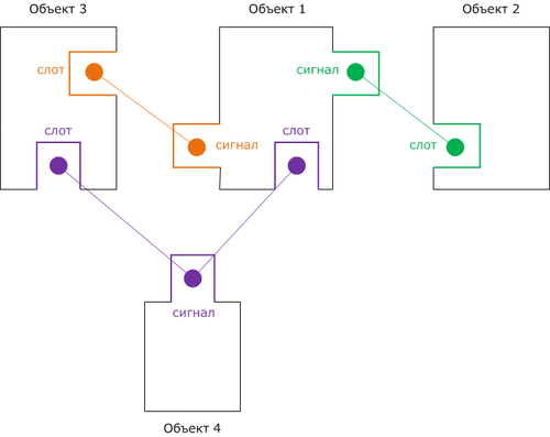 Как видно, кроме очевидных соединений, при отправке Объектом 4 сигнала выполнятся слот Объекта 3 и слот Объекта 1.