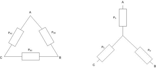 $$$P_A = \sqrt{\frac{(1 - (1 - P_{AC})\cdot (1 - P_{CB}\cdot P_{AB}))\cdot (1 - (1 - P_{AB})\cdot (1 - P_{AC}\cdot P_{CB}))}{1 - (1 - P_{CB})\cdot (1 - P_{AC}\cdot P_{AB})} } $$$