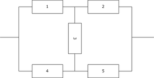 Определить вероятность безотказной работы мостиковой системы и среднее время наработки на отказ для случая $$\lambda = 0.0005$$, $$T = 100$$.