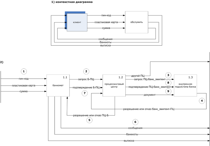Разработать DFD, организующей работу банкомата по обслуживаю клиента с банковской картой (дебетовая, с магнитной полосой). Авторизацию карты выполняет банк-эмитент (который выпустил карточку, где располагается счёт карты). Банкомат работает в режиме онлайн: запрос-ответ.