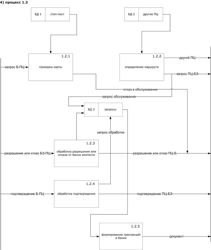 - далее определяется маршрут передачи запроса: если карта выпущена эмитентом, который не обслуживается в данном ПЦ, то запрос передаётся в другой ПЦ (1.2.2), иначе запрос передаётся соответствующему БЭ и в БД 3 сохраняется информация об этом запросе;