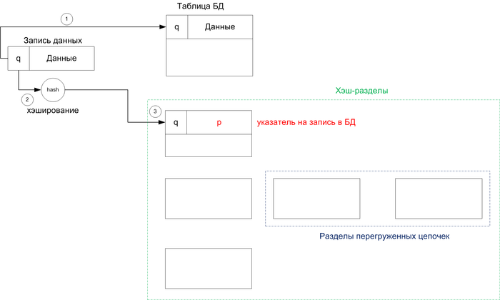 Доступ к записи можно описать с помощью следующей цепочки: $$q\rightarrow h(q) = i\rightarrow$$ чтение i раздела хэш-индекса $$\rightarrow (q, p)\rightarrow$$ чтение по p записи из таблицы БД.
