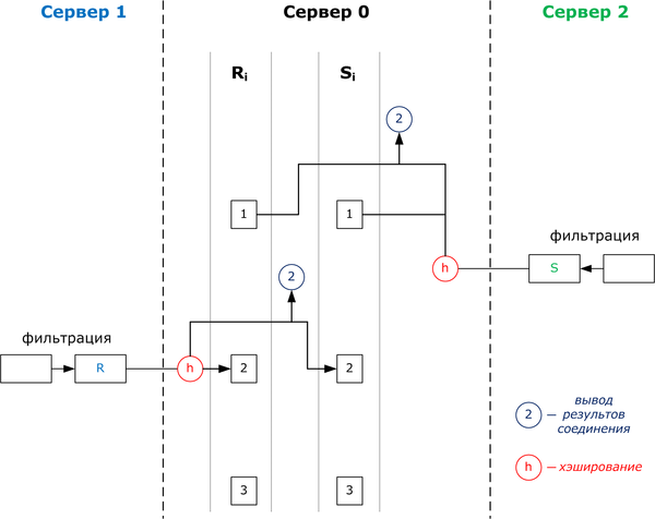 Метод хешированного соединения имеет важную особенность. В методах NLJ или SMJ соединяемые таблицы должны уже храниться на сервере перед выполнением соединения. А в этом методе соединение таблиц может выполняться асинхронно, по мере поступления записей с других серверов.