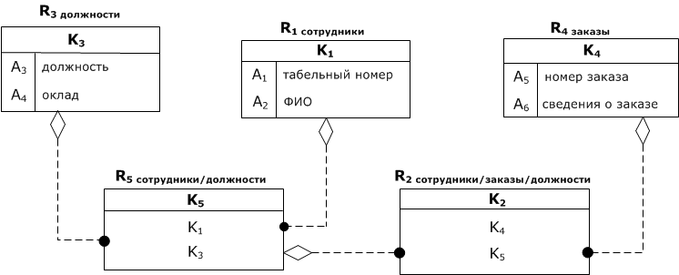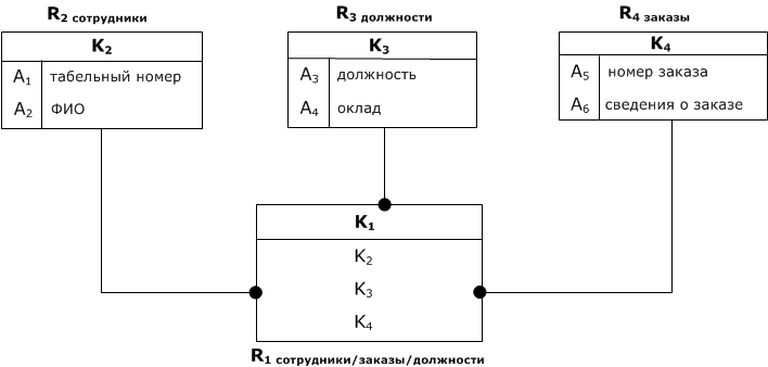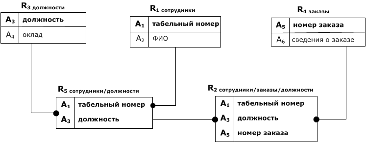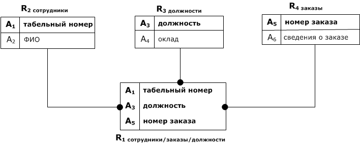 $$U$$ = (табельный номер, ФИО, должность, оклад, номер заказа, сведения о заказе) = $$(A_1, A_2, A_3, A_4, A_5, A_6)$$