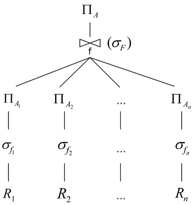 После преобразования и выделения подзапросов (как в описании, приведённом выше) получится выражение $$\Pi_A(\sigma_F(\Pi_{A_i}(\sigma_{f_2}(R_1))\times ...\times \Pi_{A_n}(\sigma_{f_n}(R_n))))$$, которое можно представить в графическом виде - это и будет логический план выполнения запроса: