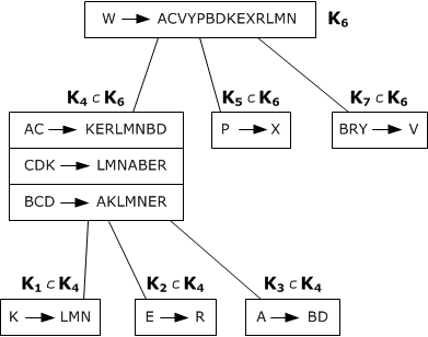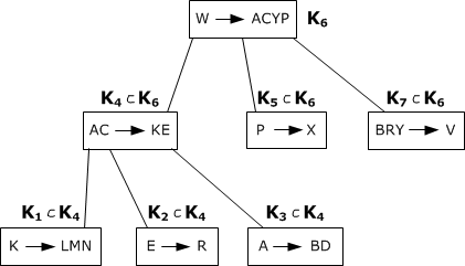 $$K\rightarrow LMN, E\rightarrow R, A\rightarrow BD, AC\rightarrow KE, CDK\rightarrow A, P\rightarrow X, W\rightarrow ACVYP, BCD\rightarrow AK, BRY\rightarrow V$$